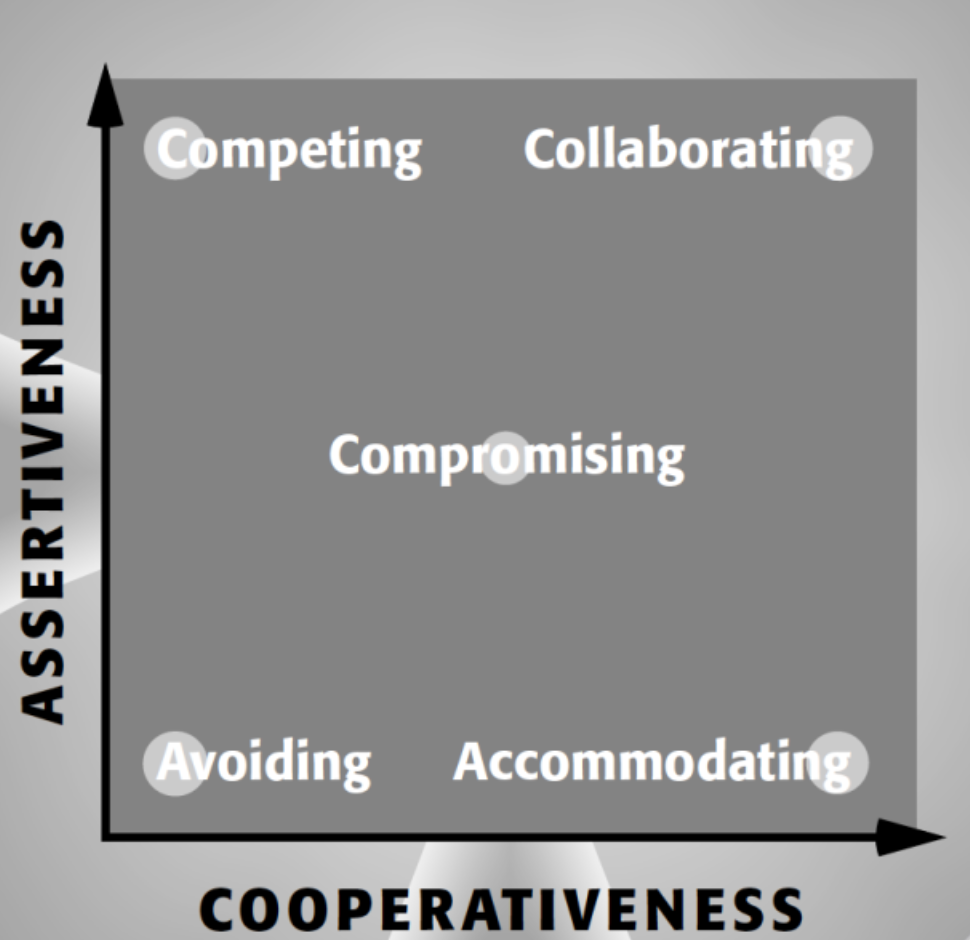 According to an well known International Conflict Resolution trainer and author, Ralph Kilmann, who noted in a recent post on April 28, 2025 the following: "Regarding ANY conflict with ANY other person, group, or team, choose the particular conflict-handling mode (competing, collaborating, compromising, avoiding, and...